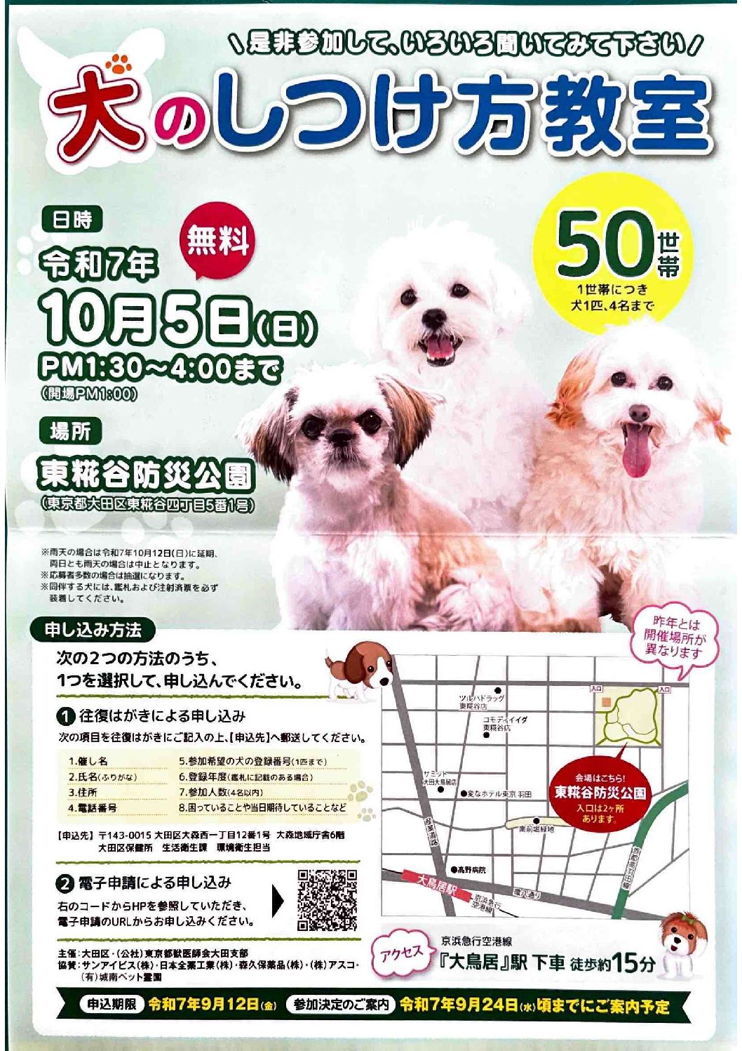 お知らせ 2025年8月24日 犬のしつけ教室開催のお知らせ \参加無料!犬のしつけ方教室 開催のお知らせ/わんちゃんとの暮らしをもっと楽しく、もっと安心に。 しつけ教室には訓練士の先生、訓練犬による実際のしつけ方を見学することができ、また訓練士の先生に質問等もできる教室となってお […]