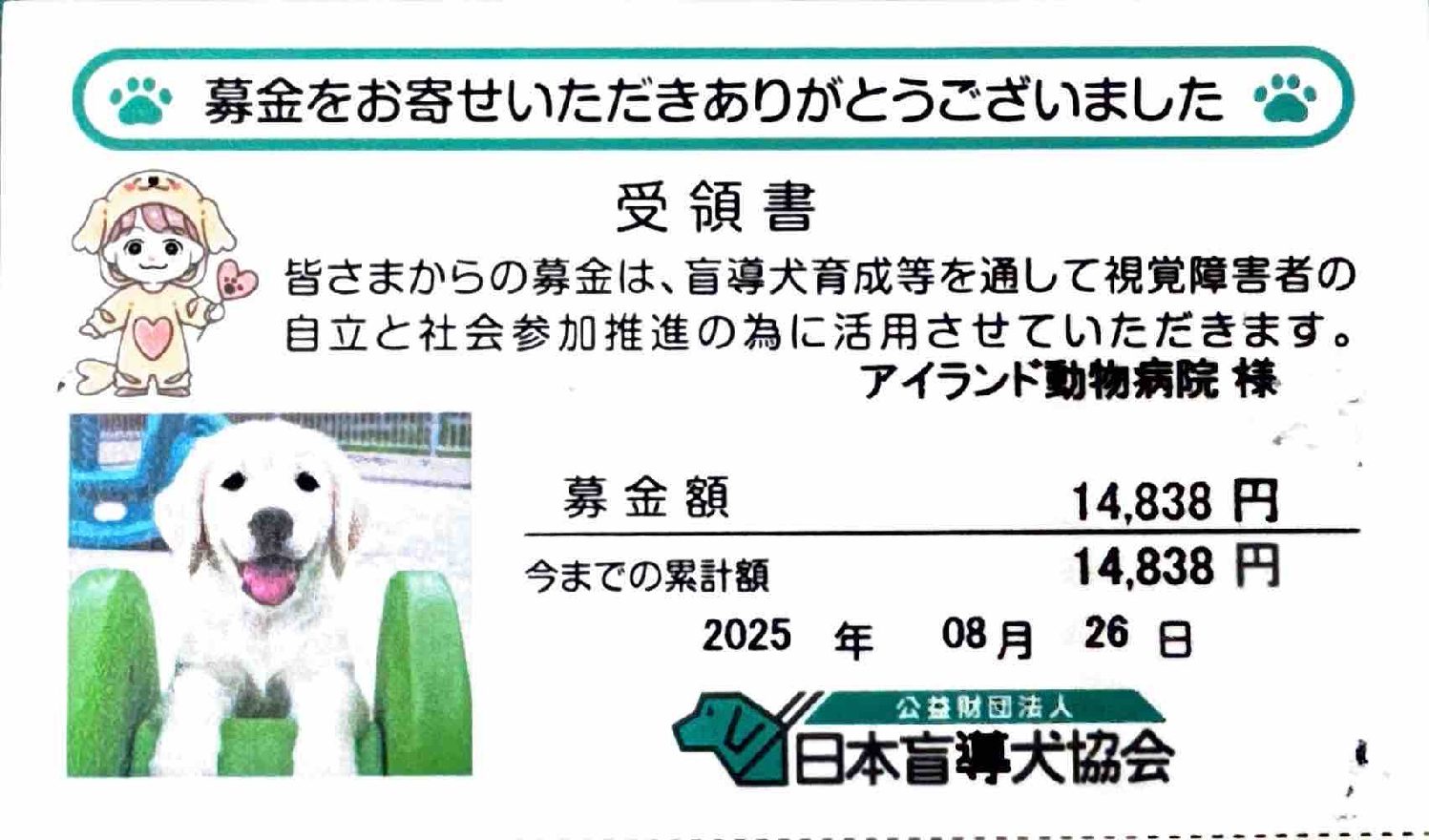 お知らせ 2025年9月1日 募金ご協力いただきありがとうございました このたび、皆さまからお寄せいただいた募金を、公益財団法人 日本盲導犬協会へ寄付いたしました。募金総額は14,838円となり、2025年8月26日に正式に受領されましたことをご報告いたします。 皆さまの温かいご支援は、盲導 […]