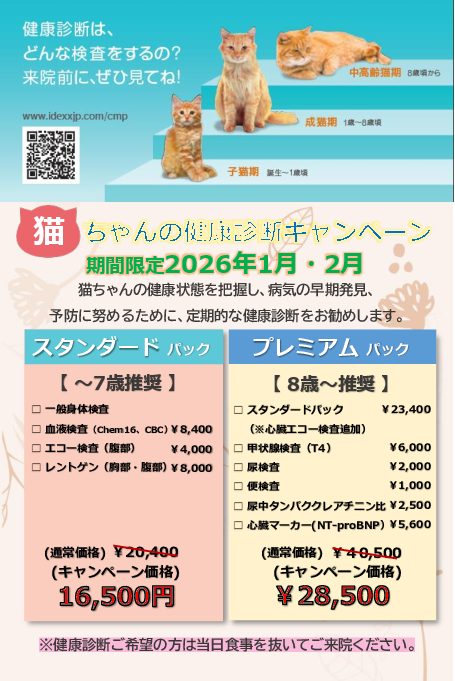 お知らせ 2026年1月18日 猫ちゃん健康診断キャンペーン 🐱 2026年 猫ちゃん健康診断キャンペーンのお知らせ アイランド動物病院では、2026年1月・2月限定で猫ちゃんの健康診断キャンペーンを実施します。 猫ちゃんの健康状態を把握し、病気の早期発見・予防につなげるため、年齢 […]