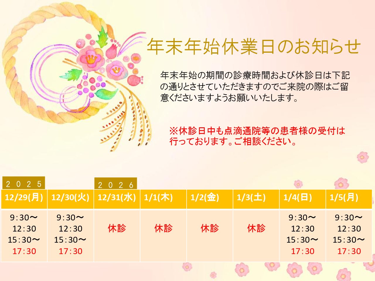 お知らせ 2025年12月9日 年末年始診療時間のお知らせ 平素より当院をご利用いただきありがとうございます。年末年始の診療時間および休診日は下記の通りとさせていただきます。ご来院の際はご確認くださいますようお願いいたします。 ※休診期間中も、点滴通院など一部患者様の受付は行って […]